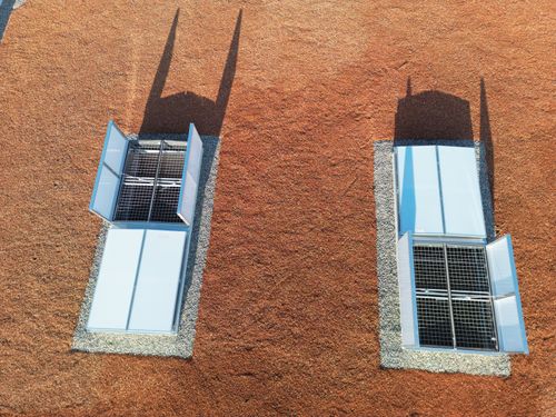 Auch das Vordach wurde im Zuge der Sanierung modernisiert. Hier wurden vier Stahl-Zargen-Aufsätze (STZA)mit den Maßen 1200 x 1200 mm und einer Höhe von 500 mm installiert, verzinkt und für eine bauphysikalische Dämmung von 80 mm ausgelegt. Davon wurden zweielektrisch betriebene Einzelklappen(1200 x 1200 mm, 5° Neigung) mit RWA-Funktion und thermischer Auslösung bei 68°sowie zwei starre Einzelklappenergänzt. Alle vier Klappen sind mit Absturzgittern ausgestattet.